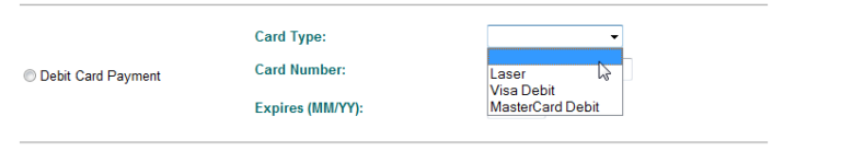 Laser or other debit card , When you hit the payment screen on the revenue there is a drop down for “Debit Card Payment”